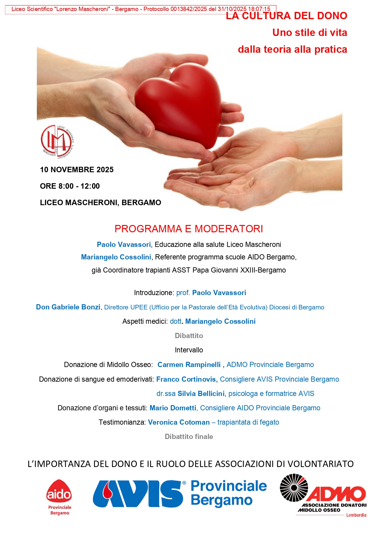 Si comunica che lunedì 10 novembre 2025, dalle 8.10 alle 12.00, le classi quarte saranno impegnate nell’ambito del progetto La cultura del dono all’evento